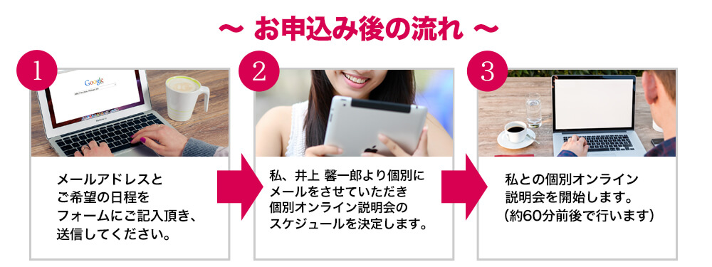 本ページからお申込み頂くと井上馨一郎が発行する個別オンライン説明会用メール(無料)に代理登録されます。登録されたメールアドレス宛てに個別オンライン説明会の詳しいご説明とスケジュール確認をお送りします。お客様にご入力頂きました個人情報は国が定める個人情報取り扱いに関する法令、指針に従い遵守します。またご入力頂きましたメールアドレスへは上述のメールの配信の他、お客様へのご連絡でのみ使用します。